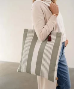 Deze vrolijke tas is saliegroen/ecru gestreept.
